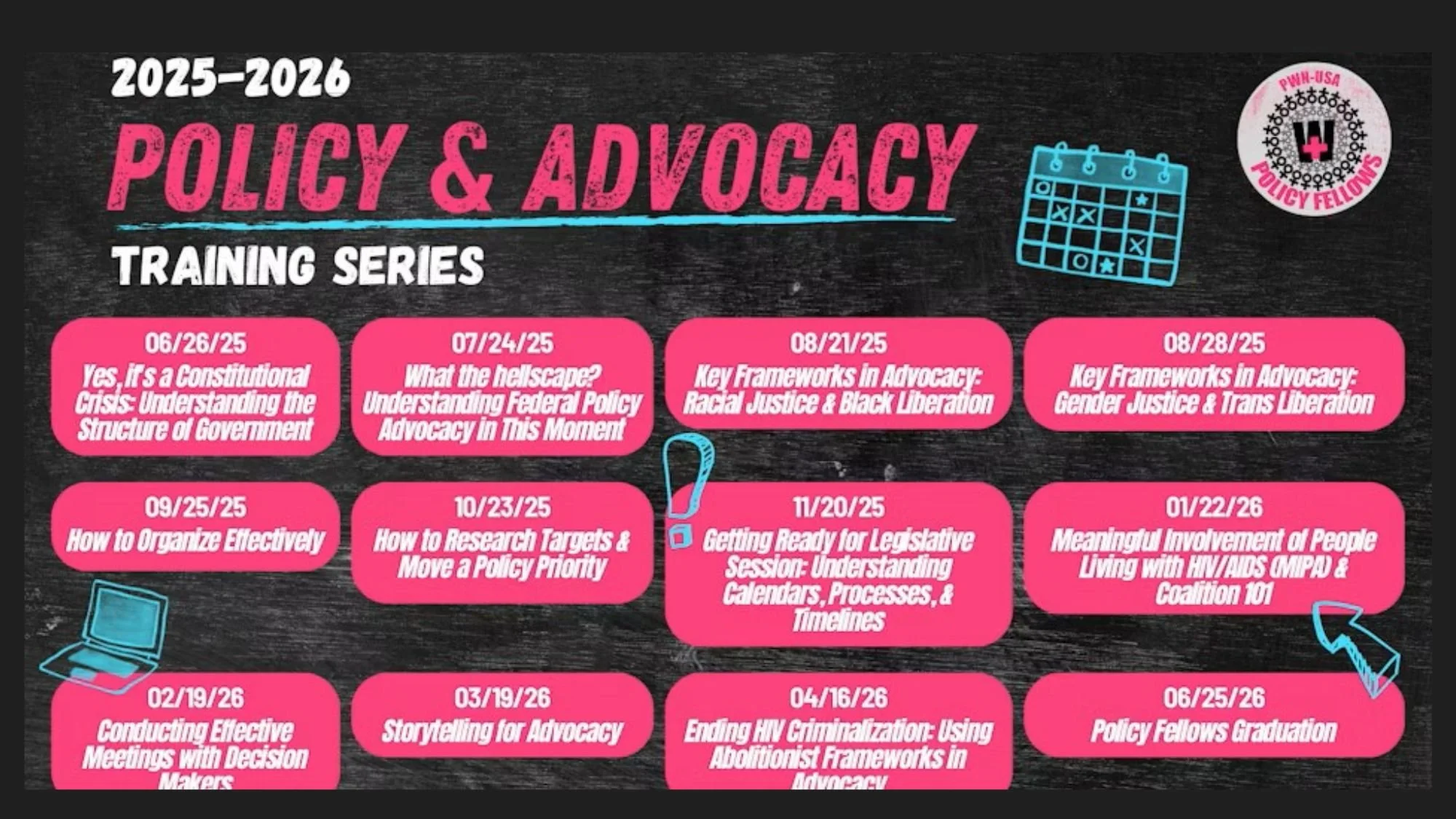 Join PWN-USA for a policy advocacy training series launching this June! We will be hosting monthly trainings focused on policy advocacy skills-building. The trainings will range in topics from providing an overview on how government processes work to how you to organize effectively on your issue to key frameworks for advocacy.