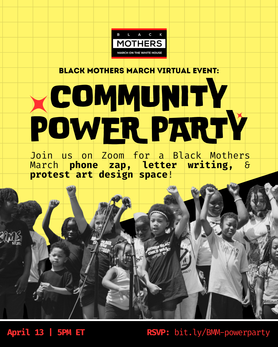 Please join us on April 13, 2026 at 5PM ET for a Black Mothers March Virtual Event: Community Power Party! We’ll invite you to participate in a phone zap, letter writing, and a protest art design space to boost the reach of and the creativity reflected at the Black Mothers March!