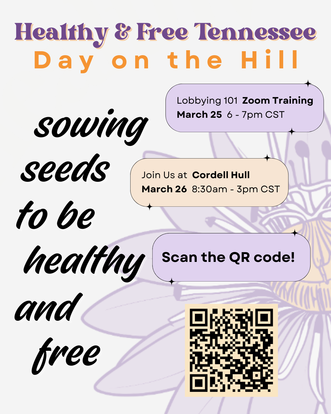Whether you're new to advocacy or a seasoned voice for change, this event is for YOU. Toolkits are provided, and you’re welcome to join as much or as little as you can. For questions, email Alayna at events@healthyandfreetn.org