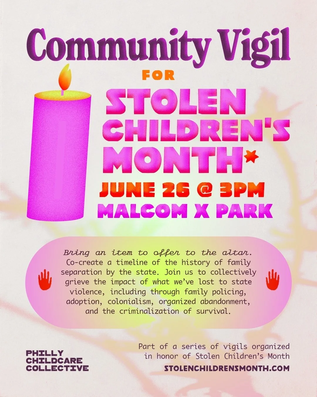 Stolen Children’s Month calls for the abolition of all systems that steal children and separate families, including the family policing, adoption, and foster industries; the ICE detention and deportation machine; and the prison-industrial complex. Throughout June, impacted leaders across the country will organize vigils, love letter gatherings, storytelling projects, and healing circles to honor stolen children and build towards healing justice.